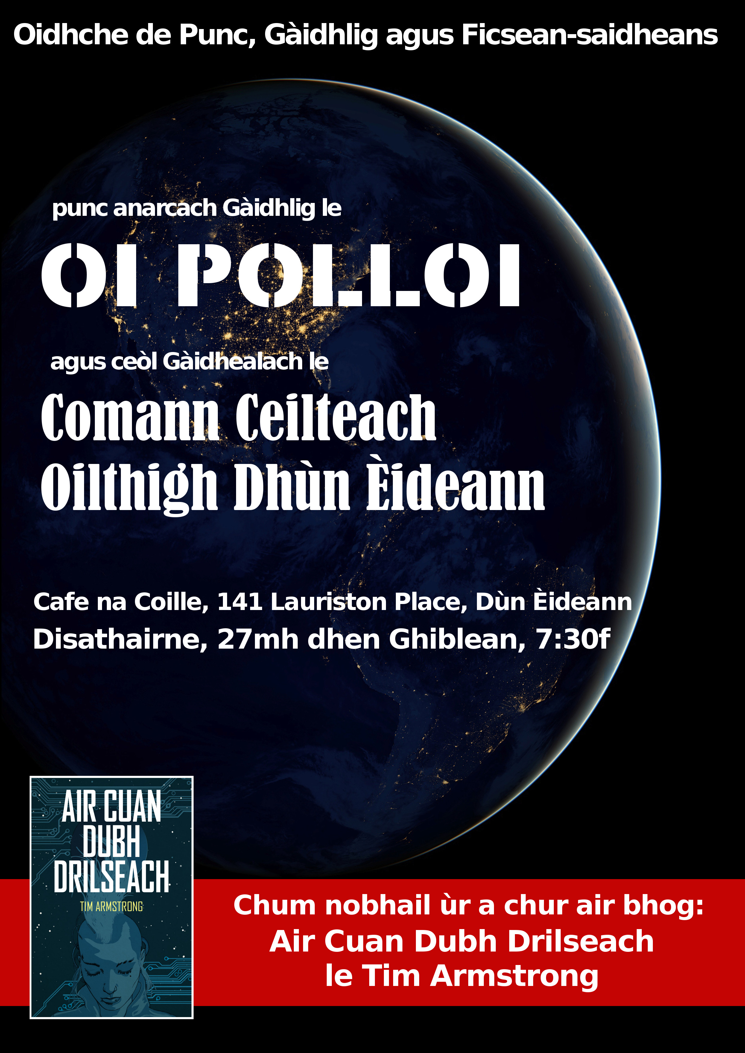 Thèid Air Cuan Dubh Drilseach a chur air bhog ann an stoidhle punc ann an Dùn Èideann aig Cafe na Coille air an 27mh dhen Ghiblean.  Bidh na sàr ròcairean, Oi Polloi, an làthair, cuide ri ceòladairean bho Chomann Ceilteach Dùn Èideann.  Thigibh ann tràth, oir tha an cafe beag.  Tha e a’ dol a bhith às a rian!