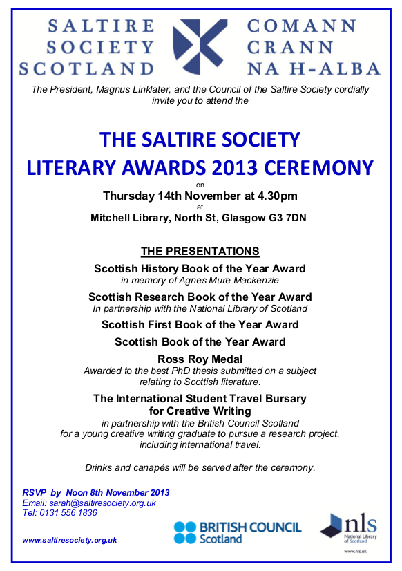 Thèid Fleadh Duaisean Comann Crann na h-Alba a chumail ann an Leabharlann Mhitchell air an 14mh latha dhen t-Samhain, aig 4.30f. Carson nach tig sibh ann! Seo an cuireadh agus ’s ann air a gheibhear seòladh puist-d na tè a tha a’ gabhail na RSVPan. Chithear gu bheil iad ag iarraidh gun RSVPar ron 8mh dhen t-Samhain, ach cha chreid mi gu bheil sin cho cudromach. Tha Comann Crann na h-Alba ag iarraidh gun tig daoine, gu sònraichte cuid aig a bheil ùidh ann an litreachas. Chithear gu bheil duilleag Facebook ann dhan tachartas cuideachd.
