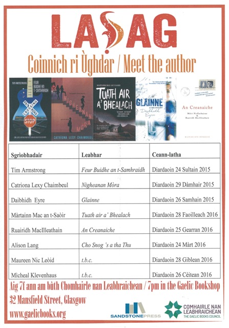 Bidh mi shìos ann an Glaschu aig Bùth Chomhairle nan Leabhraichean air Diardaoin, an 24mh dhen t-Sultain los bruidhinn mun darna nobhail agam, Feur Buidhe an t-Samhraidh. Tòisichidh cùisean aig 7f agus thèid a’ bhùth a lorg aig 32 Sràid Achadh a’ Mhansa, dìreach timcheall an oisein bho stèisean an fho-rèile aig Kelvinhall. A bharrachd air an nobhail, bu toil leam bruidhinn san fharsaingeachd mu cheòl fo-thalamh agus mu chultar nan turasan-rathaid ann an litreachas anns na Stàitean. Ma tha ùidh agaibh anns a’ chuspair agus ma bhios sibh faisg air Glaschu air an oidhche sin, tha mi an dòchas gun tig sibh ann!