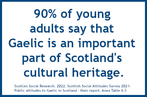 The vast majority of Scots support Gaelic as an important part of Scotland’s cultural life. Overall, 79% of adults in Scotland think Gaelic is ‘very important’ (34%) or ‘fairly important’ (45%) to Scotland’s cultural heritage’, (ScotCen 2022: 43) while 90% of young adults aged 18-29 think the same (41% very important; 49% fairly important; ScotCen 2022: Annex Table 6.3). In our fractious and fragmented modern democracies, you almost never get 90% of folk agreeing on … well … anything at all, so it is pretty amazing that here in Scotland, such an overwhelming majority of young adults agree that Gaelic is important part of our shared culture.