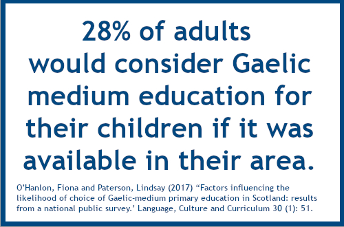 O’Hanlon, Fiona and Paterson, Lindsay (2017) “Factors influencing the likelihood of choice of Gaelic-medium primary education in Scotland: results from a national public survey.’ Language, Culture and Curriculum 30 (1): 48‒75.